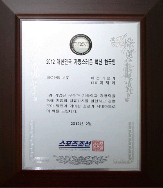 (株)美健醫(yī)療器李栽和代表理事被評選為‘2012年創(chuàng)新自豪的韓國人’。該評選由朝鮮體育報主辦, 每年在韓國發(fā)展中創(chuàng)新的領導人、企業(yè)家、團體中評選并頒獎。
