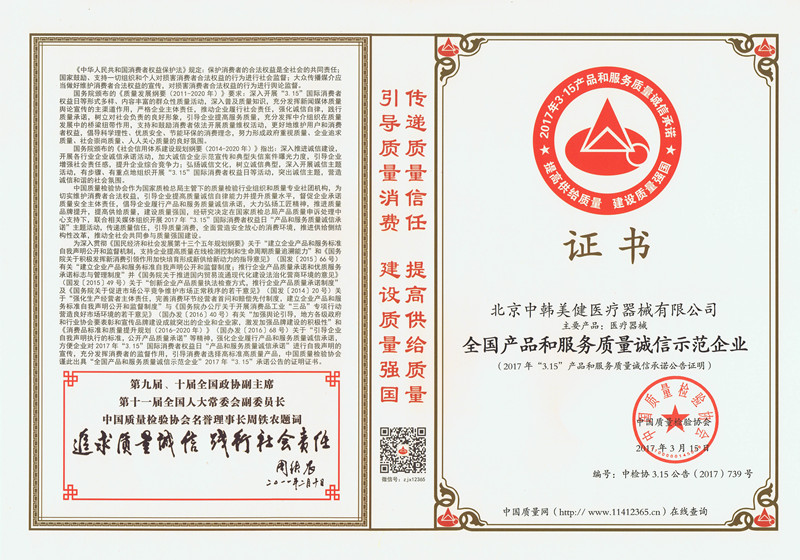 此次,美健醫(yī)療器憑借著規(guī)范的管理、優(yōu)質(zhì)的產(chǎn)品、貼心的服務(wù)在315當(dāng)天,連續(xù)8年榮獲了“全國產(chǎn)品和服務(wù)質(zhì)量誠信示范企業(yè)”榮譽(yù)稱號。